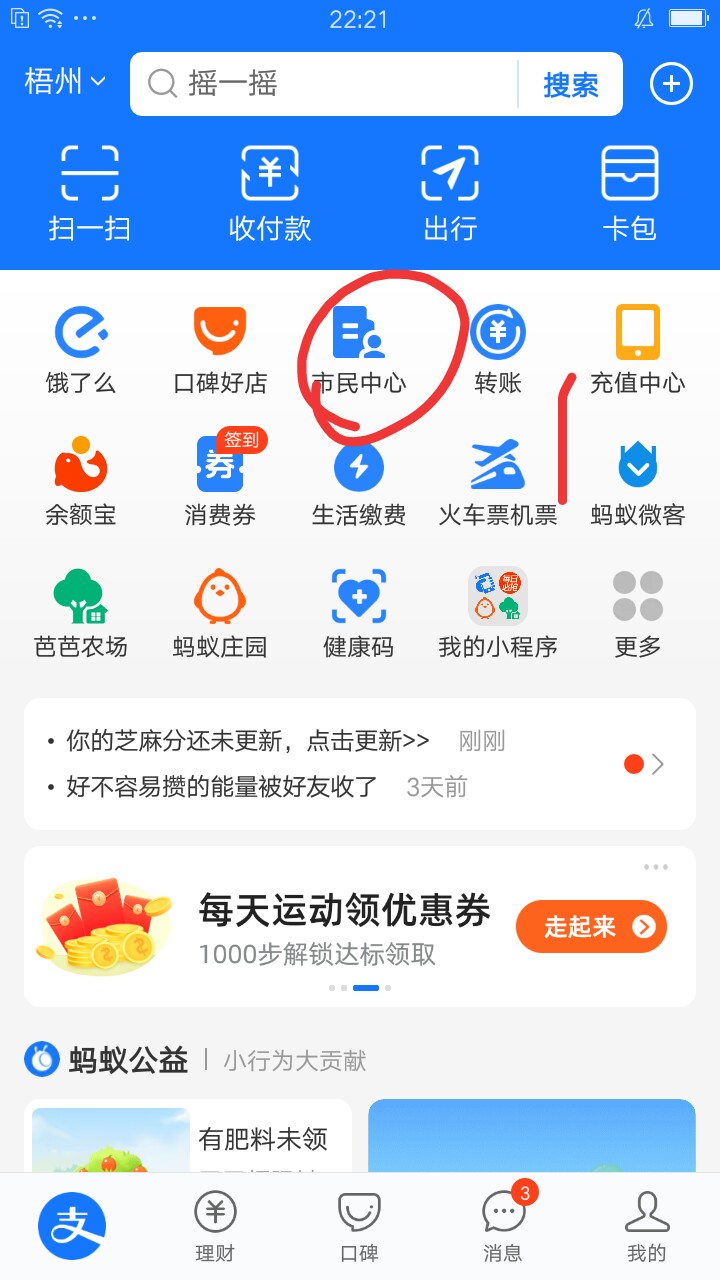 1.打开并登录支付宝,在首页中找到“市民中心”,并点击进入。