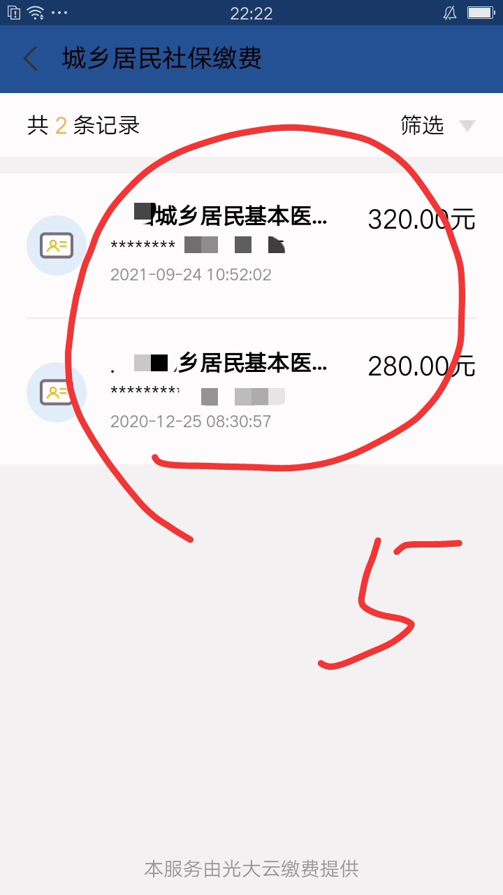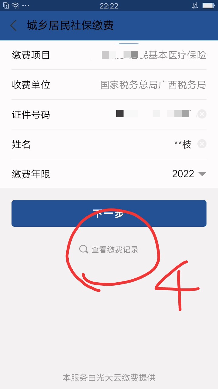 4.进入后会自动出现缴费人的相关姓名和身份证信息,在信心下方有灰色字体“查看缴费记录”,选中进入。