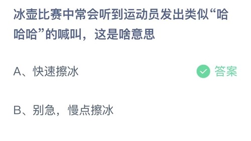 答案:快速擦冰。在冰壶比赛中,负责“尖叫”的队员一般为担任四垒的队长或投壶队员,他们通过喊叫向擦冰队友发出是否“摩擦”的指令。“哈哈哈”其实是英文单词“Hurry!”或“Hurry hard”的简称,意思是“快速擦冰”;“我我我”是“Whoa Whoa Whoa”,意为“停止擦冰”。