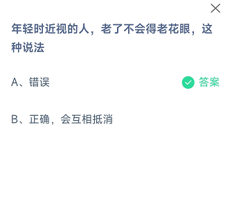 答案:错误。近视患者到了一定年龄,也会发生老花,它们不可以互相抵消。因为近视是屈光不正,老花则是晶状体退化和失去弹性,虽然临床表现近视患者的老花会比普通患者稍轻,但这种抵消非常有限。如果是严重的近视和老花并发患者,不仅在读书时要用老花镜,看远处事物时还要使用近视镜,比普通的老花患者更为麻烦。