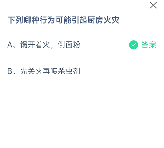 选项:A、锅开着火,倒面粉,B、先关火再喷杀虫剂