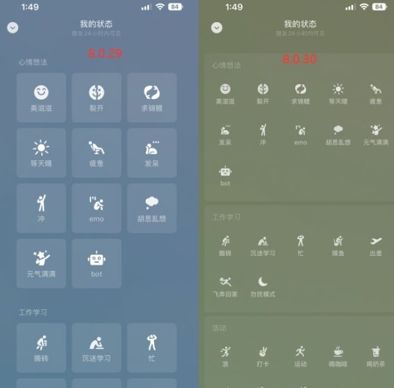 iOS微信8.0.30内测版中,在我的状态界面,状态图标缩小并进行了重新排版,可能是由于状态增多,一整个页面不容易查找,缩小之后更方便选择状态了。